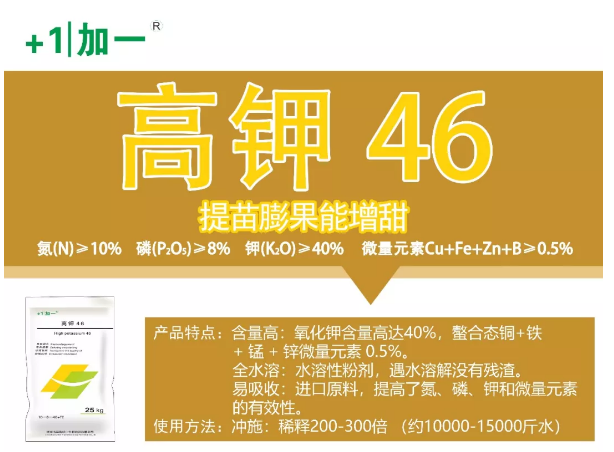 (2)花芽肥及膨果肥。建议施用加一高钾46通用型,稀释300倍水使用兑水冲施,10~20天追施一次。