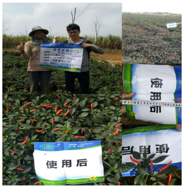 从图片我们可以清晰的看到没有使用普拉多米之前,辣椒缺素严重,叶片黄化瘦弱,辣椒产量低,着色不好,并且有枯萎的现象。