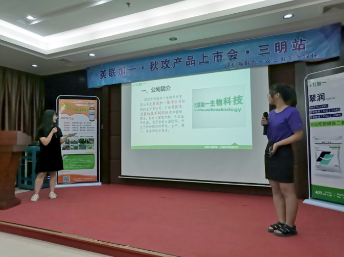 紧接着,由英联加一的产品部代表上台介绍加一秋攻主要产品:加耐特、翠润、根满壮鱼油型、果丰收着色型,让在场的零售商朋友对英联加一的产品再次有了不一样的认识。
