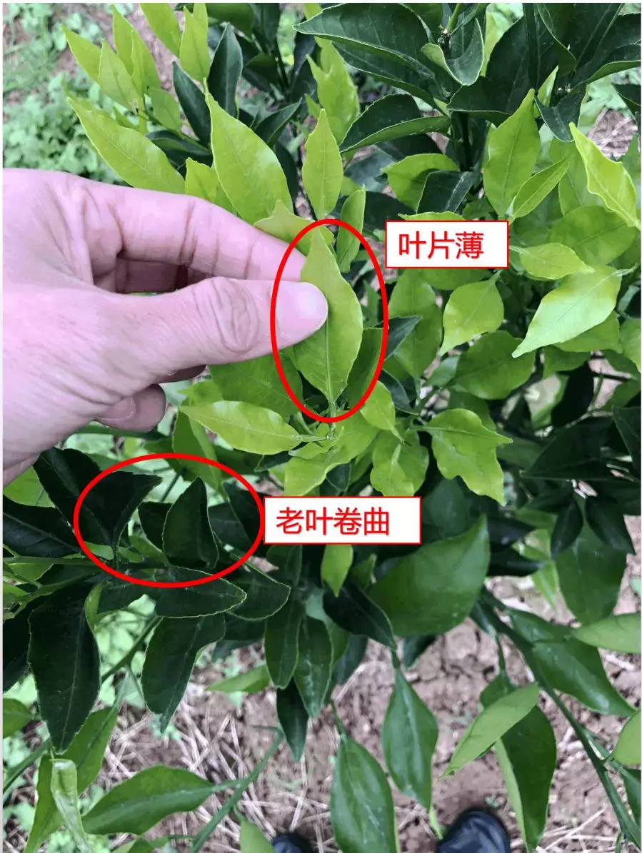 四川德阳罗江县御营镇谢先生家的柑橘幼树出现了一些问题:老叶卷曲,树势弱,晚秋梢枝条徒长,枝条叶片又薄又嫩。