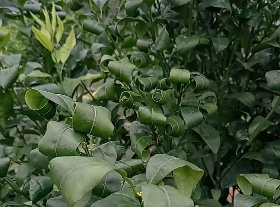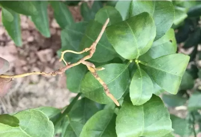 根系受损影响柑橘树对地下营养的吸收,导致植株缺乏营养从而导致老叶卷曲。