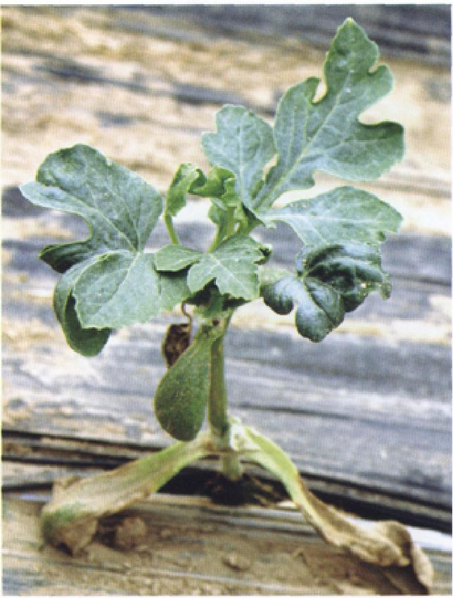 西瓜幼苗生长点退化,不能正常地抽生新叶,只有2片子叶,有的虽能形成1—2片真叶,但叶片萎缩,没有生长点。