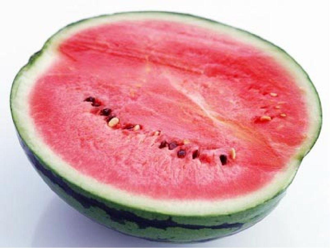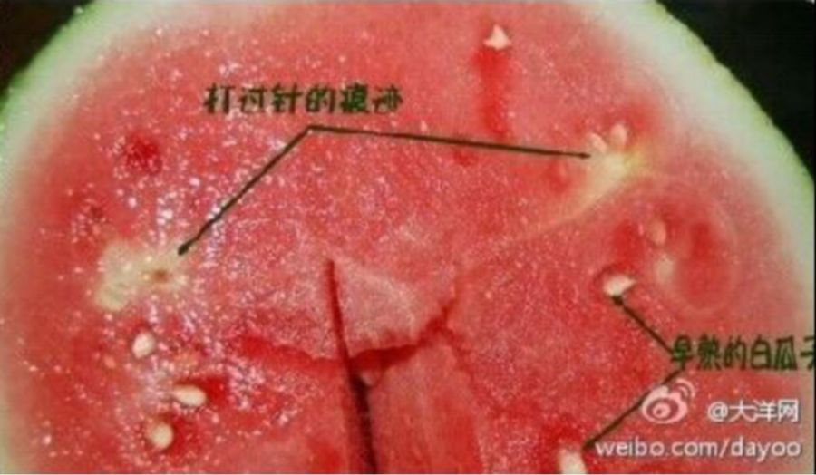 将西瓜纵向切开,从顶端花痕部到果柄部的维管束成为发达的纤维质带,通常多为白色,严重时呈黄色。