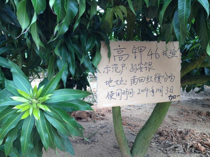 蒋大姐说:“我今年这一片果地用的药和往年一样,除了硝酸钾改用了英联加一的高钾46,旁边的台农树用的是其他品牌的硝酸钾。