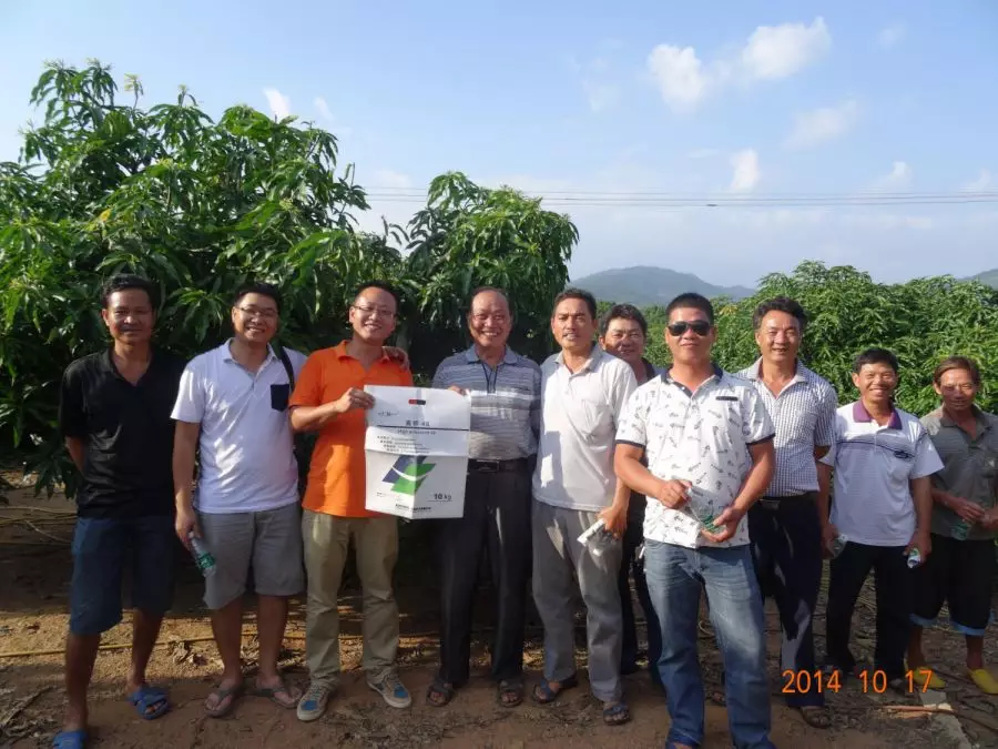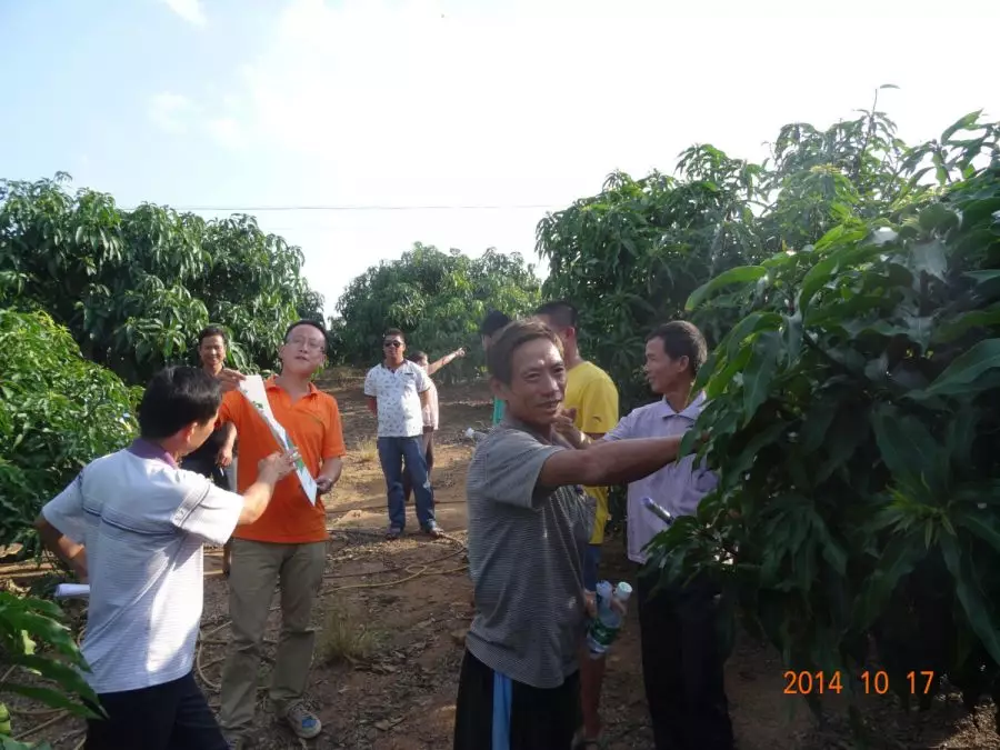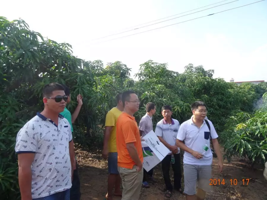 10月16日,南田农场红旗分场红东队的蒋大姐使用了加一高钾46催花后看到了十分明显的效果。于是海南省三亚市南田农场植物医院组织专业种植户近20多位,一行二三十人10月16日下午2点,开车前往蒋大姐家的芒果园进行实地观摩。