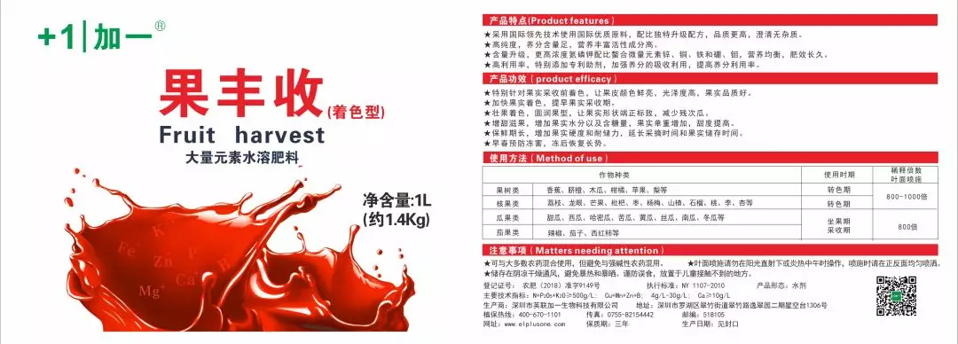 为了延续果丰收在果实上膨大增甜滋果的效果,英联加一2014年重磅推出果丰收着色型,让果实更鲜亮,口感更甜。水果成熟的色泽形状将直接影响到果实收购的价格,对于英联加一来讲,我们一直都在努力提高果实的色泽形状和口感。