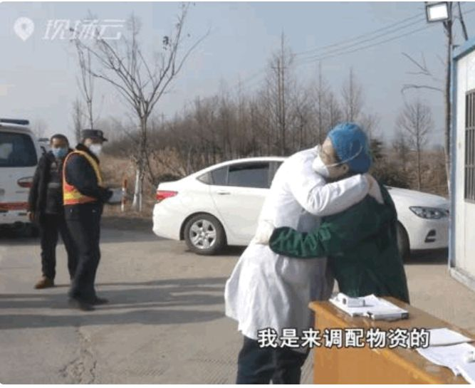 两人隔着防护服通过眼神认出彼此