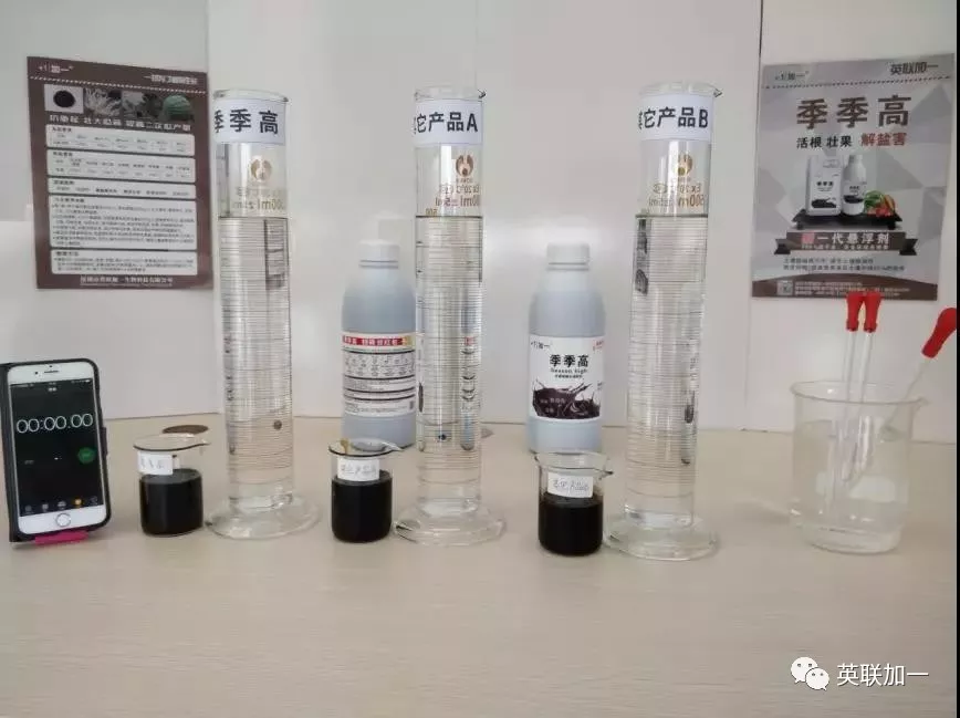 为了验证英联加一悬浮剂产品——“季季高”在水中的扩散性如何。我们将季季高与市面上的其他厂家生根促苗的产品进行对照实验。首先我们先来看一下季季高对比实验的视频。