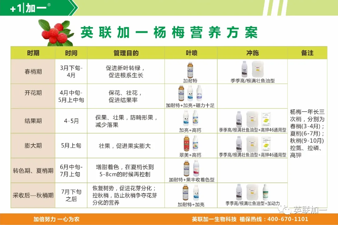 此时花芽、叶芽正在萌发期,需要补充中微量元素来提高杨梅花的质量。此外,这个时期也是根系活动期,需要补充有机质和大量元素来补充根系生长需要的养分。主要以磷、钾、硼、镁等元素为主。