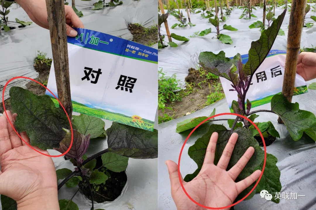 从高度对比可以看出,使用根满壮鱼油后的茄子节径要高出一截,叶片也要大很多。叶面厚绿有光泽。