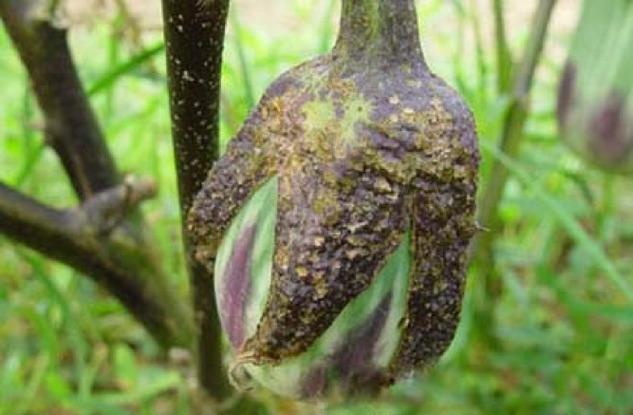 茄子僵果也称“石茄”是黑紫色的,茄子果实形状不正,果实较硬,朽住不长,剖视可见果肉发黑,不能食用即僵茄。多在冬春茬栽培的前期和后期以及露地栽培的后期产生。此外也会产生萼下龟裂果、偏平果、毛边果等畸形果。茄子根系发育缓慢,吸水范围窄,尤其幼苗不耐干燥。对外界环境要求高。温度低于17℃,花粉发芽,生长不良,不能完成受精,导致单性结实,产生僵果。即使花粉落到雌蕊上,花粉管伸长不良,即形成僵茄。温度高于35℃,短花柱花增多,是落花及发生僵茄原因之一。当昼夜温度都过高时,同化养分消耗增多,致苗质变劣。为了提高温室栽培茄子前期坐果率,经常使用激素处理,虽然坐果数量增加,但如果同化作用所提供的营养物质不能满足大量果实生长发育的需要,果实发育不起来,就会形成僵果。在气候干燥,施肥过多,肥料浓度过高、水分供应不足时,植株同化作用降低,营养不足,也易出现僵果。育苗期白天保持26-30℃,夜温17℃;二叶期后控制在14-15℃。最低气温保持在14-15℃,地温16-17℃,白天注意增加采光,棚温控制在30℃以下,及时通风换气,防止高温引起僵茄发生。结果期要及时、适量浇水,不能过度控水。灌水要均匀、浇透,浇水后及时放风排湿。露地茄子注意雨后排水。摘叶茄株生长中、后期,要适当摘除下部老叶,但摘叶不要过多。施足充分腐熟的有机肥,注意氮、磷、钾肥合理配合施用,不能缺钙。发现有少量僵果后,可喷施季季福,高钙,翠润等水溶肥,促进植株生长,减少僵果。 |