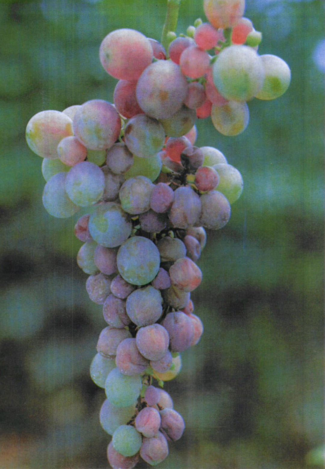 2.在白色品种上病果粒表现为水渍状,感病果粒糖度降低,味很酸,果肉逐渐变软,皮肉极易分离,成为一包酸水,用手轻捏,水滴成串溢出,故有“水罐子”之称。