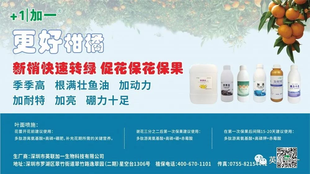 4. 叶面肥。喷施含生物刺激素、磷钾元素的肥料(加耐特+加亮),使柑橘恢复生长,提高抗病性。