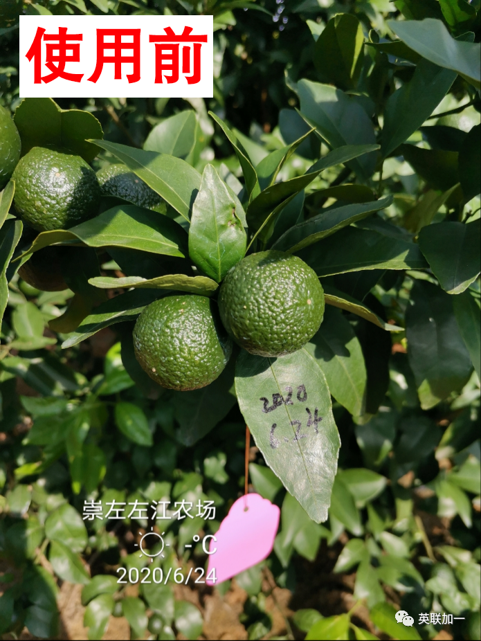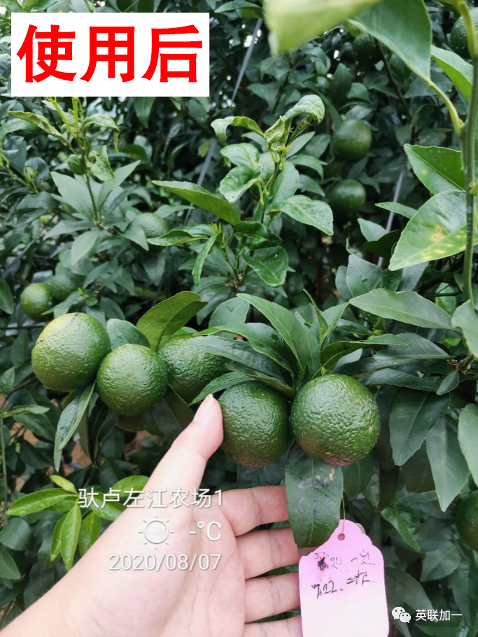 柑橘日灼病:是柑橘果实在快要成熟时的一种病害,主要原因是在夏秋高温季节,果实经受强烈日光暴晒,是果实表面温度达到40度以上而出现的灼烧现象。1、沃柑根系在25℃温度以上生长受到抑制,当温度达到37℃以上根系停止吸水吸肥。3、中微量元素不足,特别是Ca、Si、B,细胞液浓度降低,体内水分运输能力减弱。4、大量使用农药、调节剂,造成角质层、蜡质层变薄,抗晒能力降低。2、A 多肽、氨基酸能够促进叶绿素的合成。(叶绿素主要是脂类和蛋白质分子组成)。B 增加叶子及果实表面的蜡质层,减少水分蒸腾,阻止病原体侵入。3、氨基酸、海藻酸,让柑橘叶子和果面油光发亮,促进蜡质层形成,形成“防晒膜”,树体降温5~10℃。4、钙硼锰锌同补,调节细胞液浓度,提高水分运输能力。用了加耐特的柑橘,果实油绿有光泽,不容易被太阳灼伤。使用了加耐特的柑橘依旧油绿有光泽,未使用加耐特的柑橘已出现明显的日灼现象。 作者:英联加一 来源:创新生物营养科技,成就更好的生活 点击:565次 日期:2023-07-11 |