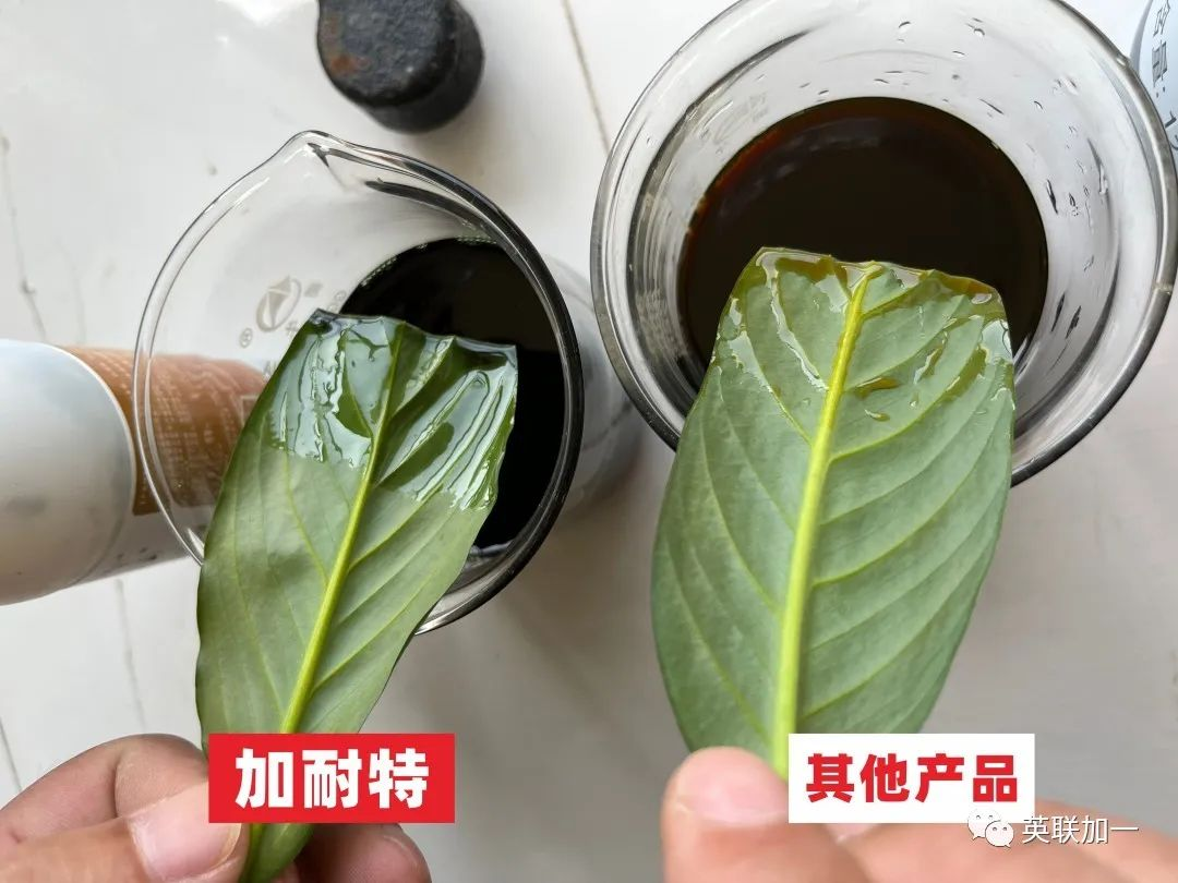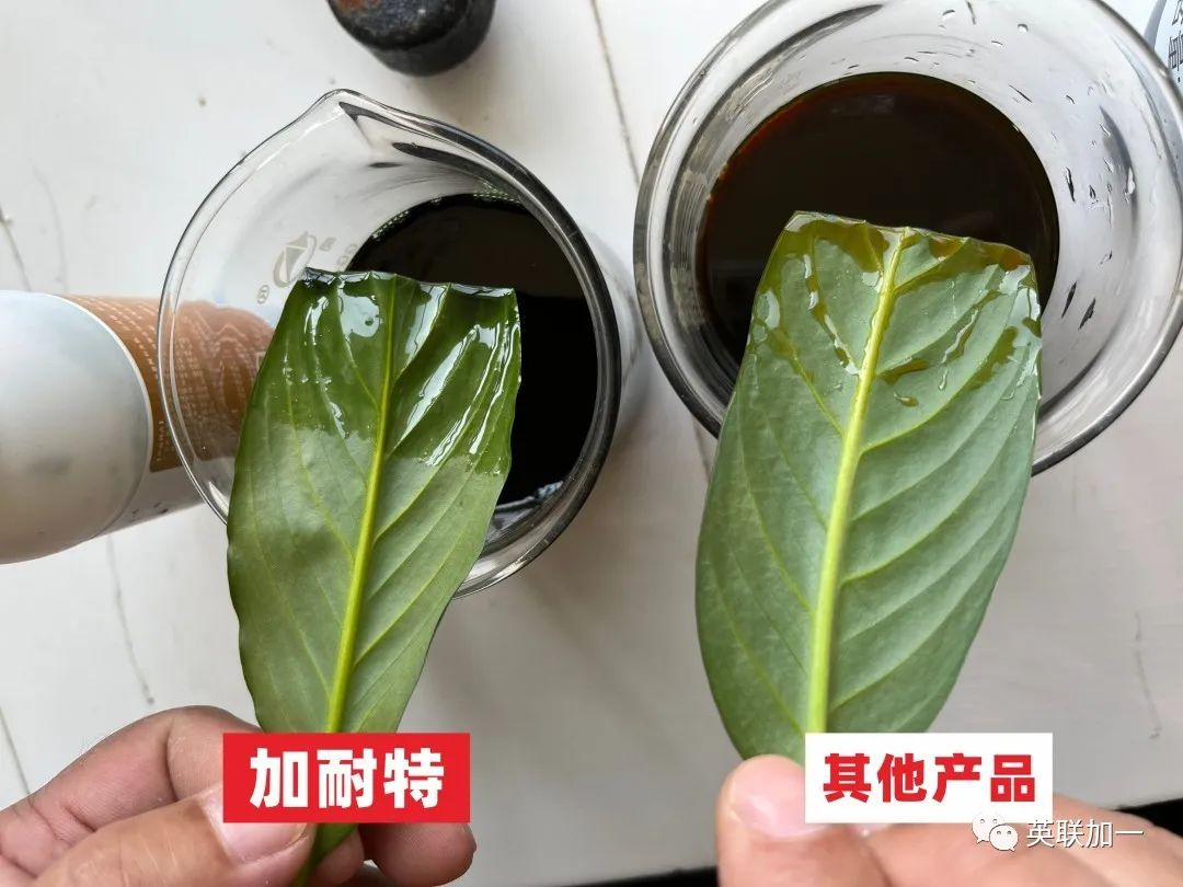 为了消除广大顾客的疑虑,我们进行了加耐特溶液与植物叶片的吸附性和展着力实验,并且与某市场知名品牌同类产品做了对比实验。
