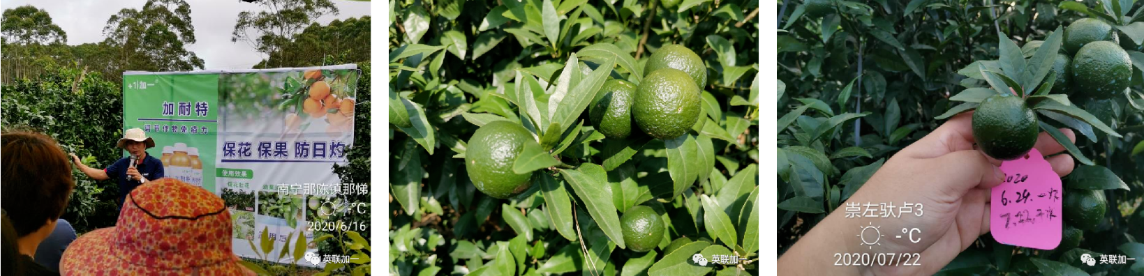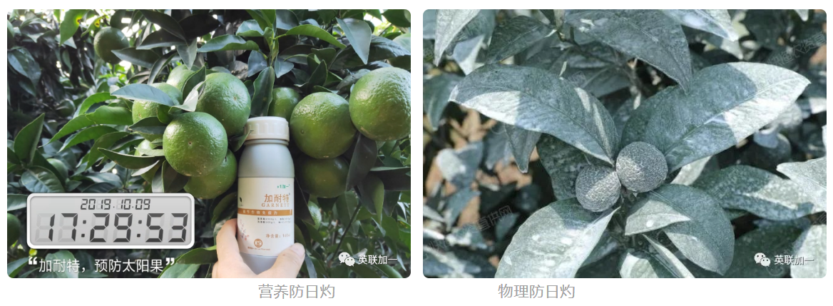 英联加一的加耐特这款产品,刚好符合营养防日灼的解决方案,这是一款非常成熟的产品,已在南宁沃柑上防日灼应用多年,取得了非常好的效果。