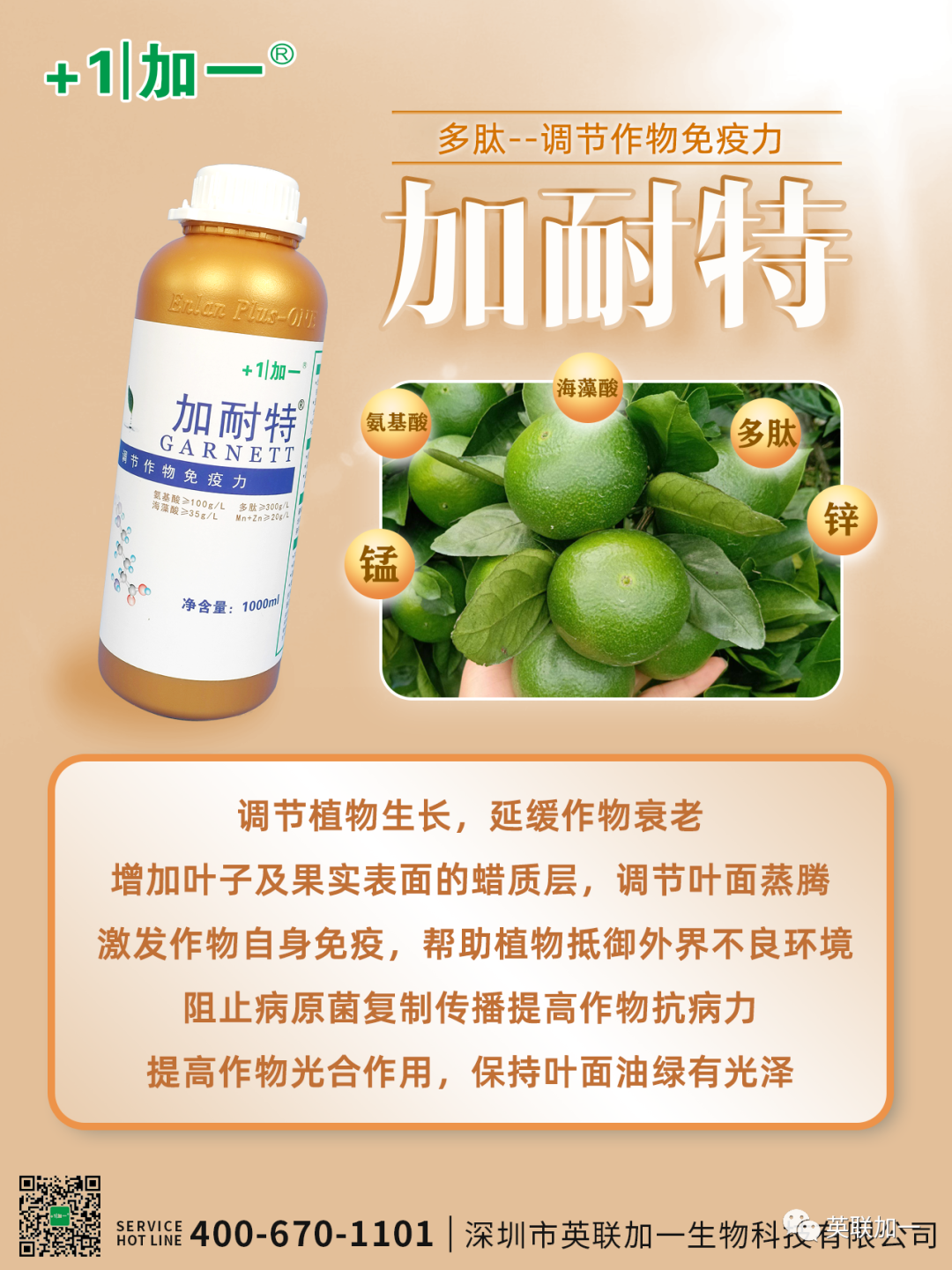 主要是因为它富含合成叶绿素的多肽氨基酸及中微量元素。加耐特的主要成分是:氨基酸≥100g/L,多肽≥300g/L ,海藻酸≥35g/L,锰+锌≥20g/L。 并且具有4大特点:1、多肽含量高:300g/L ;2、复配海藻酸、锰和锌,调节免疫力;3、专利AMK助剂,吸收高效,混配性优;4、比重大1:1.5,纯营养,安全。 加耐特防日灼使用方法:1、高温来临前7-10天开始使用,连续使用3次,间隔10-15天。2、1000倍喷施。3、与英联加一高钙&望霞搭配使用效果更佳。 |
