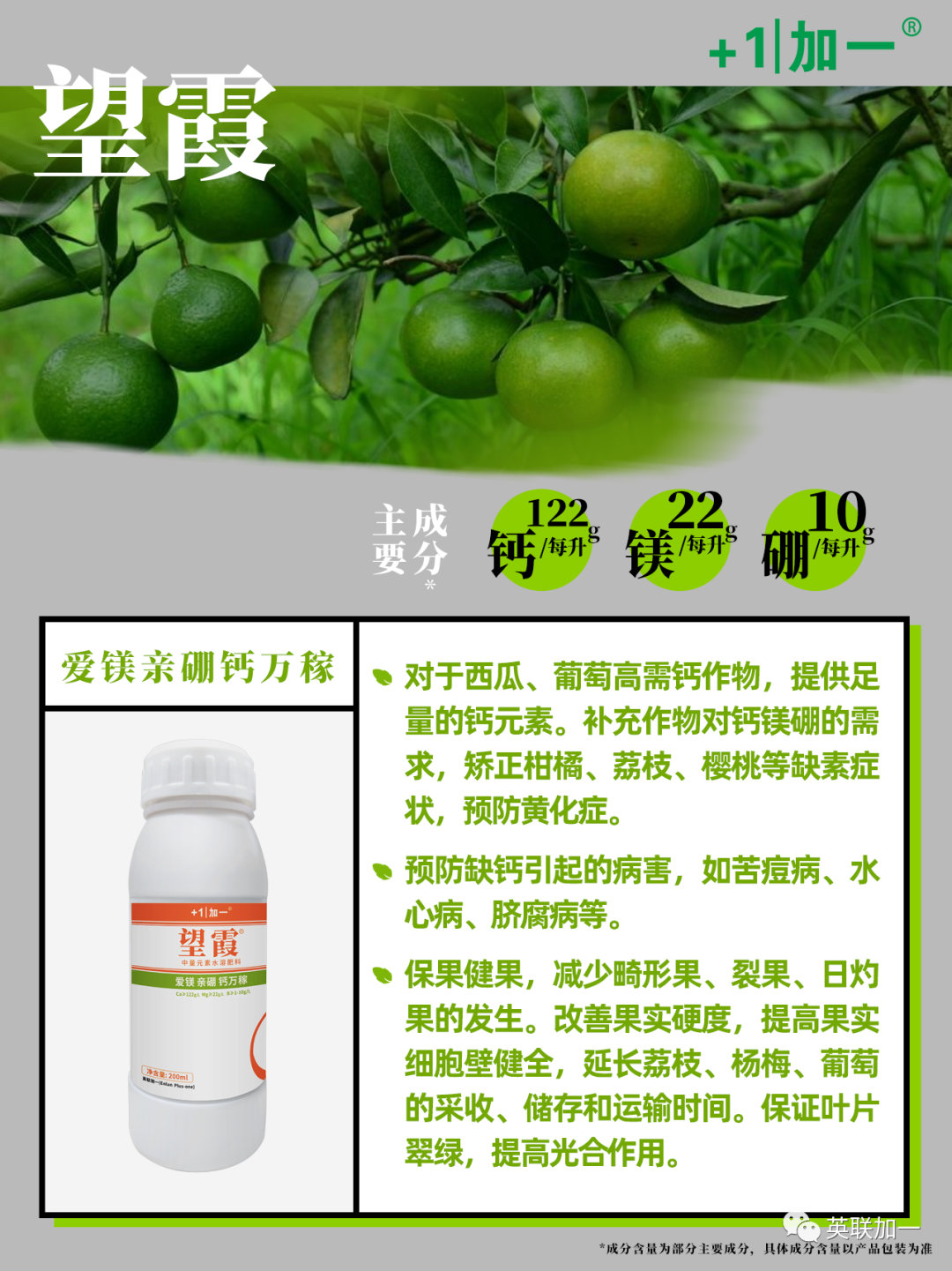 给苹果树补钙可有效促进果实着色和果面蜡质形成;葡萄、西瓜、樱桃等作物都需要大量的钙,特别是膨果期,协调细胞和细胞壁的协调生长,预防裂果。以上告诉我们,作物适时补钙能减轻病虫害的发生,大大提高果品质量。