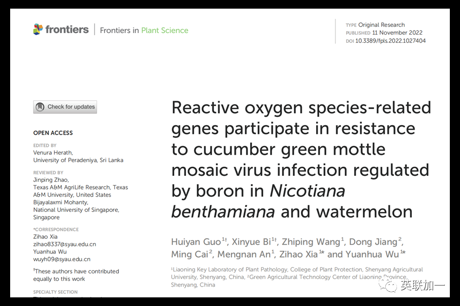 沈阳农业大学植物保护学院吴元华教授团队,一直致力于CGMMV致病性和寄主抗病性相关研究,并制订了辽宁省CGMMV检测和防控技术规程,对该病害的防控成果获得辽宁省科技进步二等奖。该团队围绕这一问题,已发表多篇高水平研究论文。自2022年以来,接连在国际顶尖农林学期刊Mol. Plant Pathol. (中科院1区,2021年影响因子5.520)和J. Agri. Food Chem. (中科院1区,2021年影响因子5.895)分别发表题为“A novel strategy for improving watermelon resistance to cucumber green mottle mosaic virus by exogenous boron application”和“Suppression of cucumber green mottle mosaic virus infection by boron application: from the perspective of nutrient elements and carbohydrates”的研究论文,系统报道了硼元素参与西瓜抗CGMMV的分子调控机制。