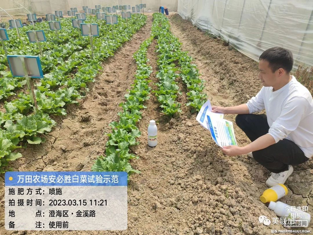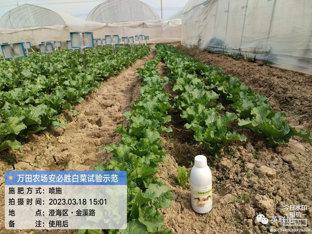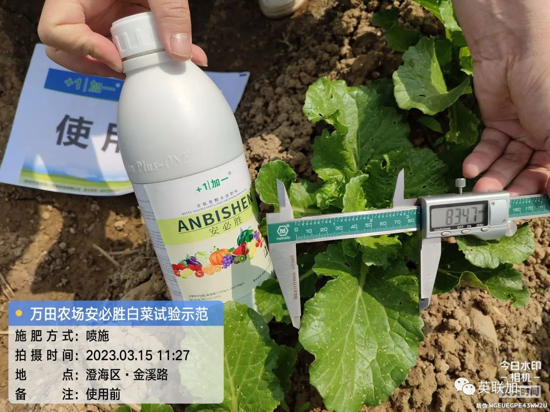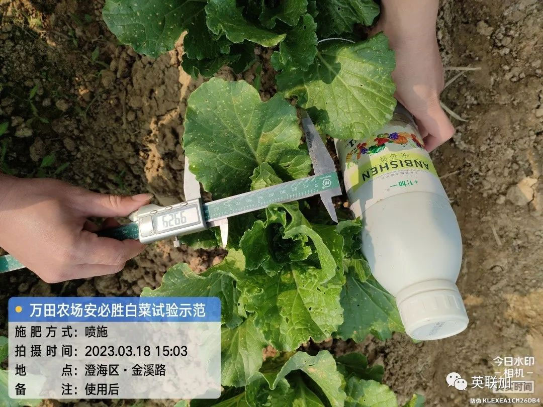 三月,乍暖还寒的气候特征,给从事农业种植的朋友带来了不小的影响,广东省汕头市澄海区的一个种植园种植的作物也不同程度的受到影响。英联加一的技术人员在经过实地考察后,了解了李老板种植园的实际状况后,加一技术人员向他推荐英联加一新一代生物刺激素产品——安必胜。 地点:广东省汕头市澄海区 用户:李老板 品种:白菜 产品:安必胜 使用方法:1000倍喷施 试验目的:受管理不善和营养不足影响,叶黄、生长受阻。 使用时间:2023年3月15日 回访时间:2023年3月18日 效果表现:1. 使用三天后白菜生长迅速、整体长势转好,植株迅速长大。2. 经测量数据显示,叶片增宽明显。叶片生长更为健康。