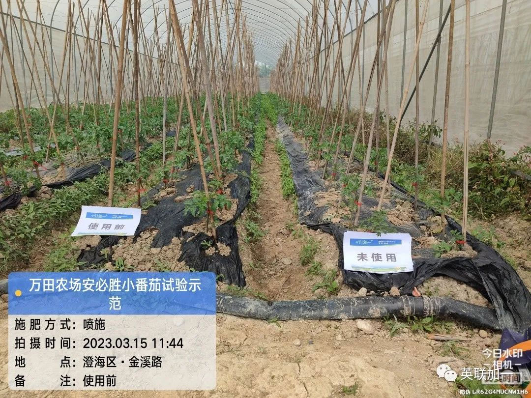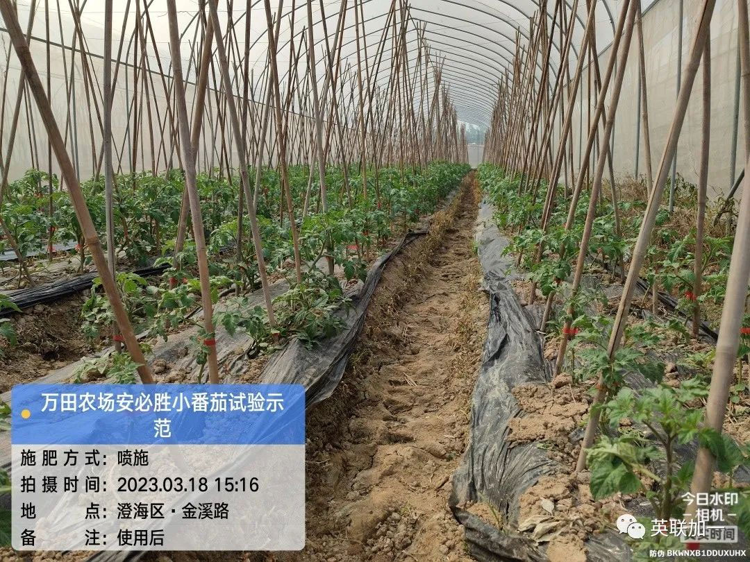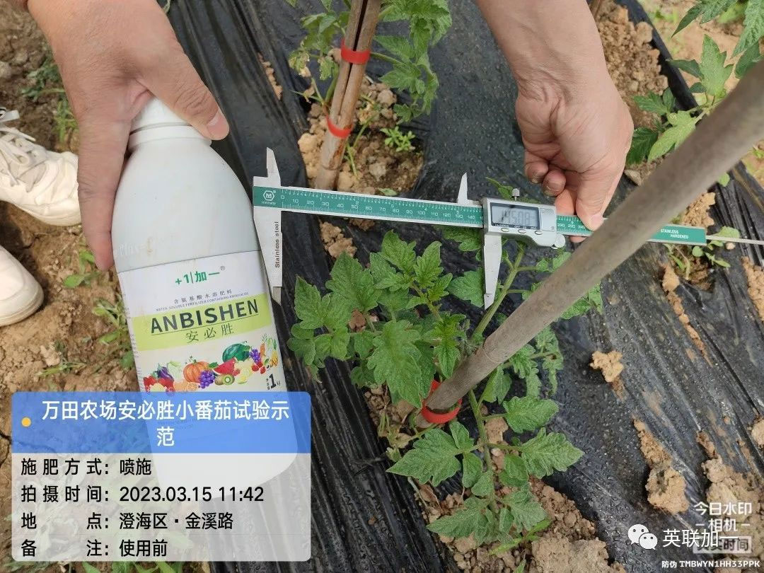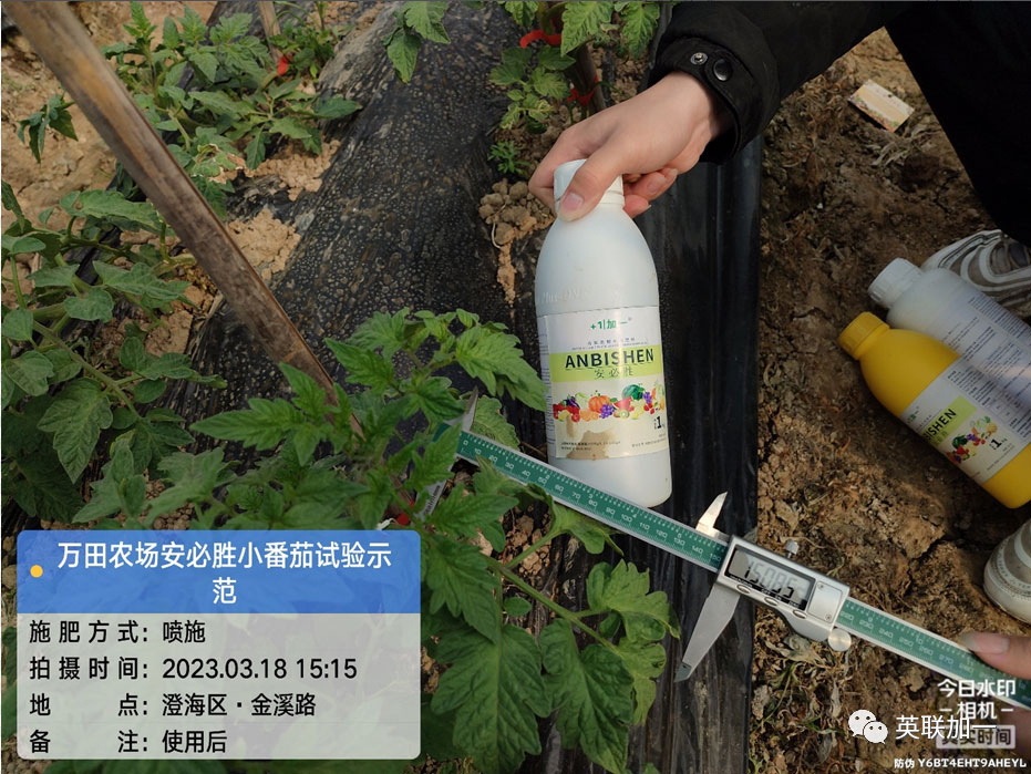 点击查看大图 地点:广东省汕头市澄海区 用户:李老板 品种:小番茄 产品:安必胜 使用方法:1000倍喷施 试验目的:受天气和管理影响,生长受阻,长势不旺; 使用时间:2023年3月15日 回访时间:2023年3月18日 效果表现:1.整体长势好转,植株高度明显增加,开始有快速生长趋势。2.经测量显示,番茄羽状复叶长度增长明显,小叶皱缩减少,叶面舒展度和颜色明显转好。