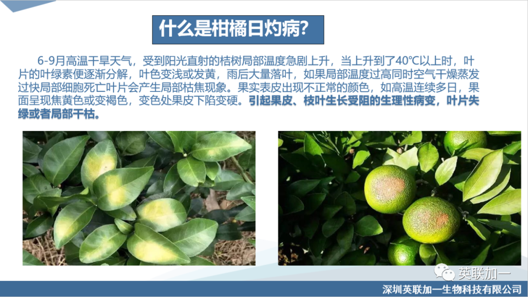 高温和暴晒,特别是在40℃以上时容易造成日灼病。以柑橘为例,当柑橘果面、叶面温度超过40℃,叶面及果面叶绿素将加速分解,导致叶面失绿黄化。